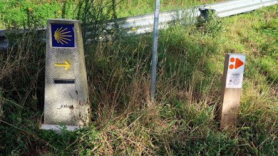 Mojón del "Camino de Santiago" y el de la "Ruta dos Muiños"